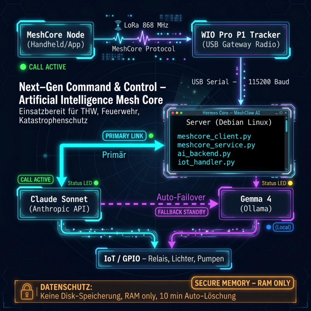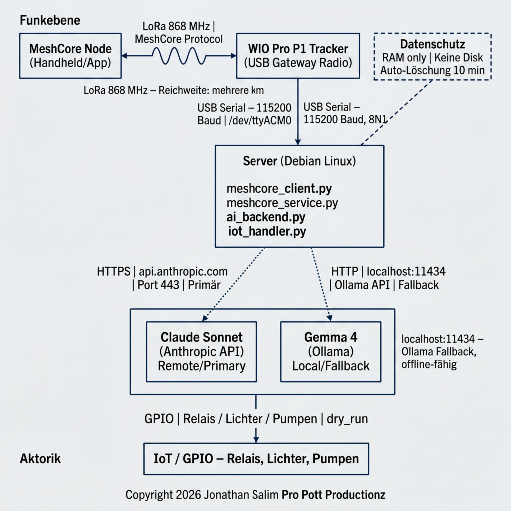 meshcore_client.py. - KI-Schicht: Ein Dual-AI-Backend wählt automatisch zwischen Claude Sonnet (Anthropic API, Internet erforderlich) und Gemma 4 (lokal via Ollama, komplett offline).