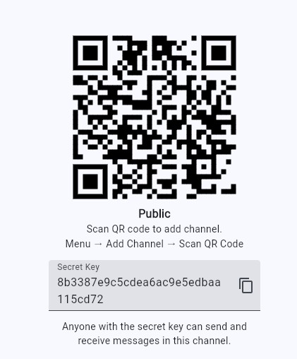 Sie können diese Kanäle mit der MeshCore App hinzufügen. Dies kann manuell mit dem unten stehenden geheimen Schlüssel oder durch Scannen des QR-Codes erfolgen.